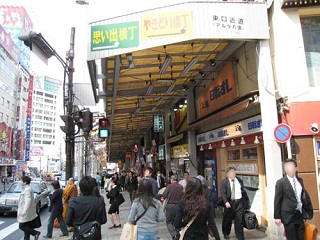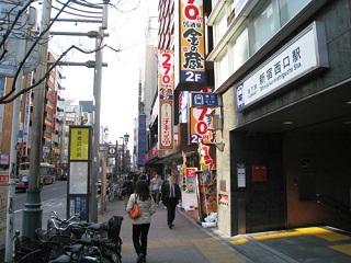 右手には大ガード(線路)、正面にはパチンコ屋やカラオケ店が入ったビルが見えています。
